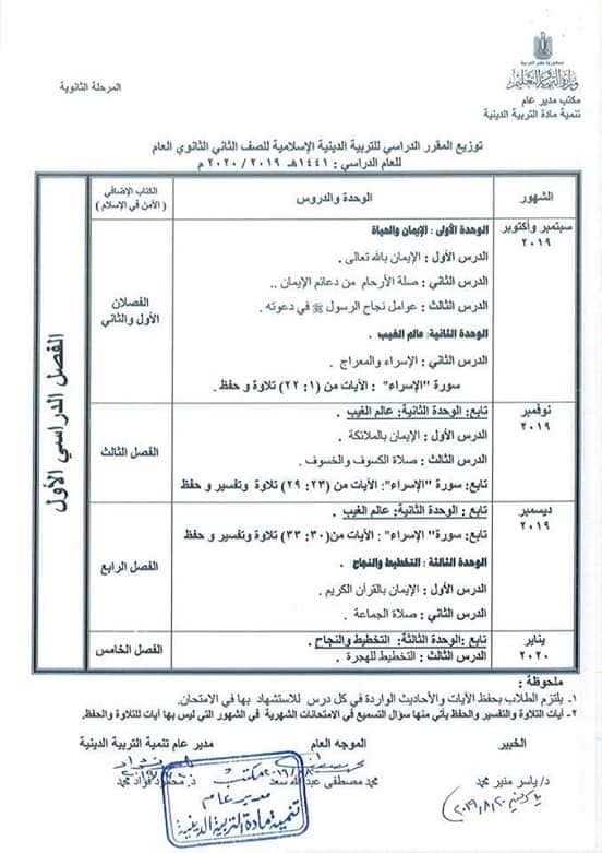 توزيع منهج التربية الدينية الإسلامية للمرحلة الثانوية الترمين 2020 مذكرات تعليمية