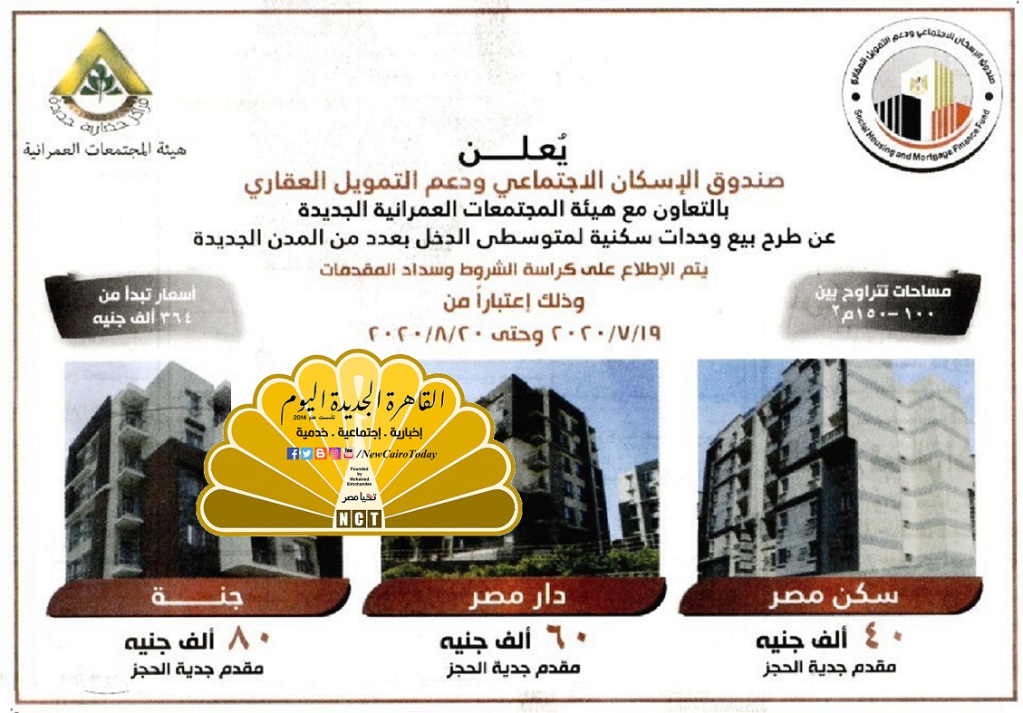 اعلان صندوق الاسكان الاجتماعي عن طرح بيع وحدات سكنية لمتوسطي الدخل بعدد من المدن الجديدة 10 7 2020