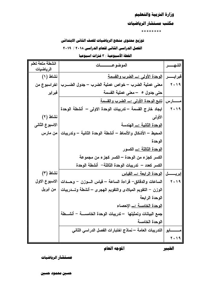 توزيع منهج الرياضيات للصف الثاني الإبتدائي الترمين 2018 2019