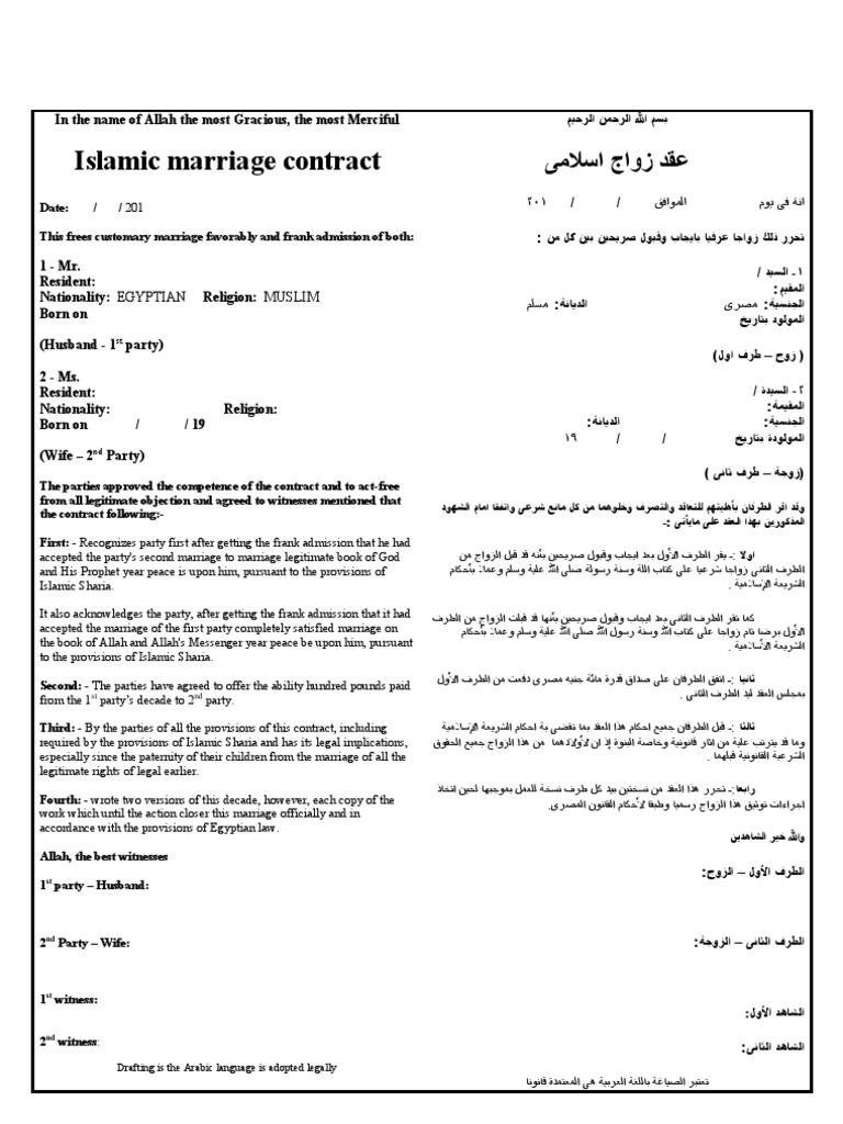 Marriage Contract عقد زواج اسلامى باللغتين العربية والانجليزية God In Islam Prophets And Messengers In Islam