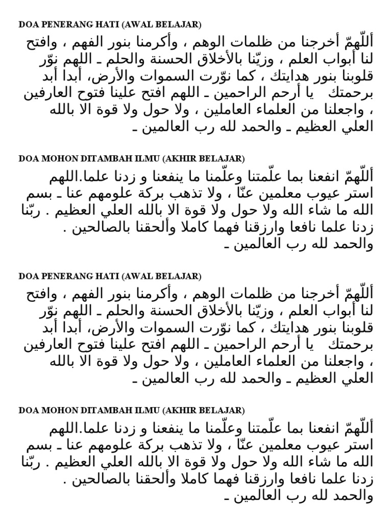 Berikut dikongsikan doa doa yang merangkumi doa sewaktu belajar doa penerang hati serta doa menghadapi peperiksaan yang boleh dihafal dan diamalkan semua pelajar tidak kira semasa menghadapi peperiksaan upsr pt3 spm atau lain lain. Doa ketiga sebelum belajar yakni. Doa sebelum sedang dan selepas belajar berdoa adalah ibadah. ا لل ه م اف ت ح ع ل ي ن ا ف ت و ح ﭐلع ار ف ي ن و ار ز ق ن ا ف ه م الن ب ي ـي ن و إ ل ه ام ﭐلم لا ئ ك ة الم ق ر ب ي ن ب ر ح م ت ك ي آ أ ر ح م.