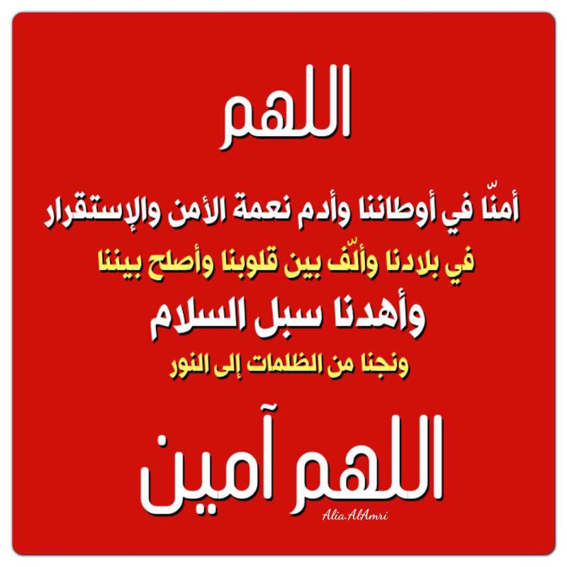 اللهم آمنا في أوطاننا أمين الأمن في الوطن والامن على النفس والمال والولد حاجة نفسية لايشعر بقيمتها الكبيرة الا من فقدها اللهم احفظ لهذه البلاد الطاهرة امنها وامانها وولاة أمرها. الل ه م آم ن ا في الأ وط ان و ب ار ك ل ن ا في الس ن ة و الق رآن و أ ق ول ه ذ ا الق ول و أ ست غف ر الله. اللهم آمنا في أوطاننا وأصلح ولاة أمورنا واجعل ولايتنا فيمن خافك واتقاك واتبع رضاك. الأحد 07 يناير 2018.