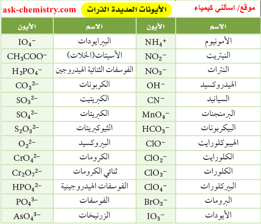 المركبات الايونية جدول الأيونات السالبة والموجبة